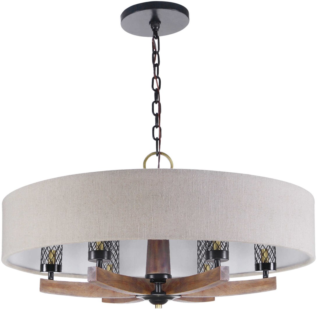 Unique Curved Wood Arms Combined With Modern Oatmeal Linen Fabric Hanging Outer Shade Give This 6 Lt.chandelier A Clean Update Feel. Special Woven Mesh Shades Offer A Distinctive Detail Along With The Dark Bronze & Antique Brass Accents. With 6-60 Watt Max Candelabra Sockets Also Includes 7' Of Chain And 20' Of Wire For Adjustable Installation.Read More